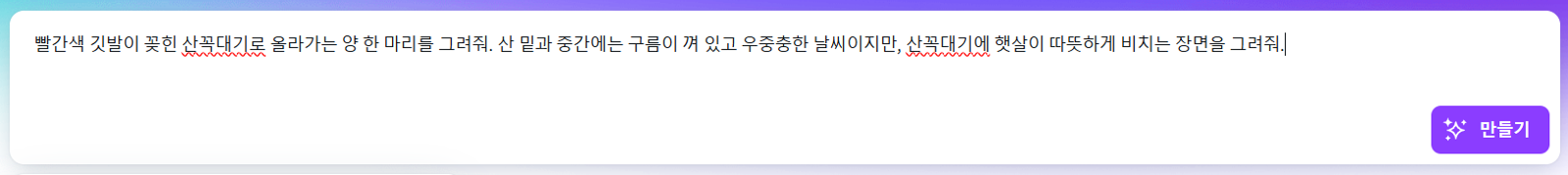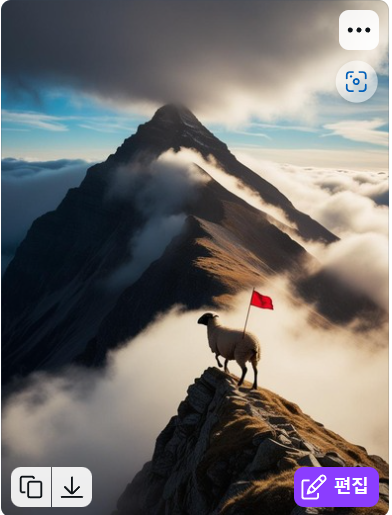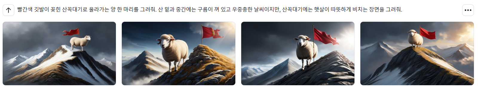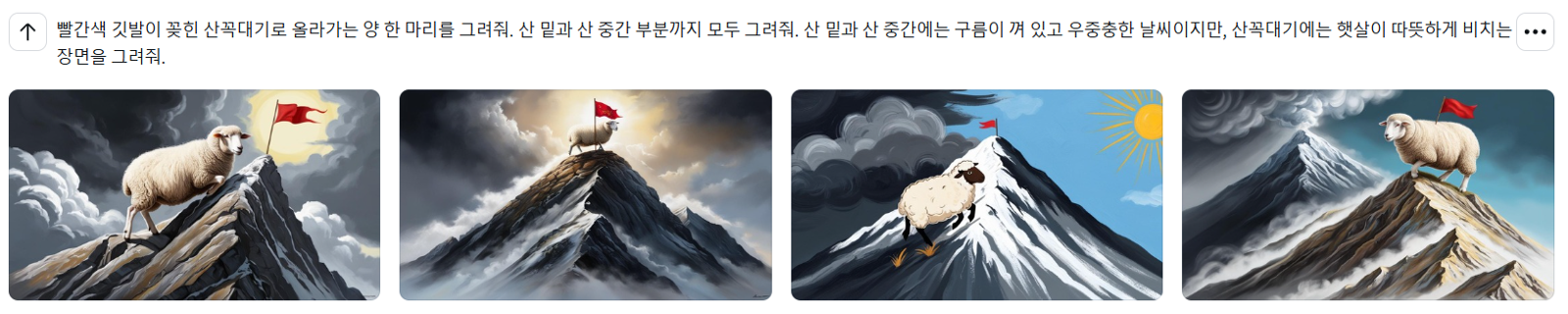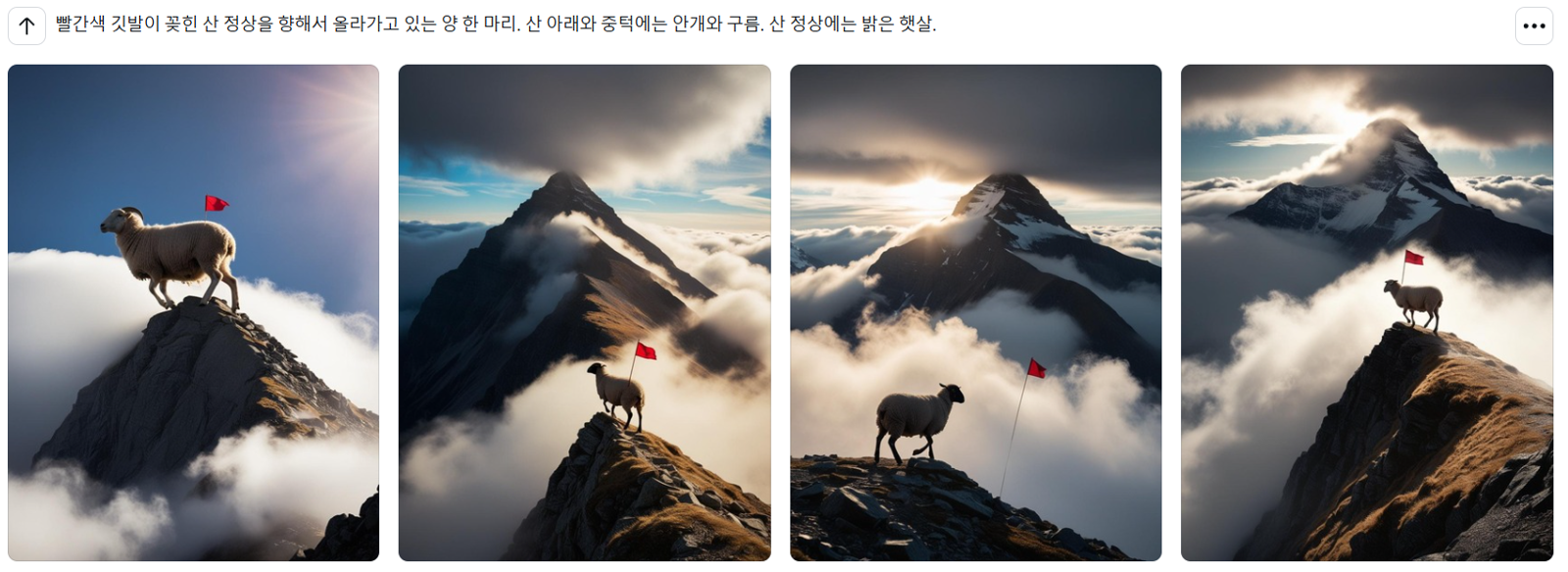 저는 '산꼭대기를 올라가는 양'과 '산 아래와 중턱'까지 묘사된 이미지를 원했기 때문이죠. 그럼 프롬프트를 약간만 바꿔서 다시 이미지를 생성해볼게요. "산 밑과 산 중간 부분까지 모두 그려줘"라는 명령어를 추가했어요.