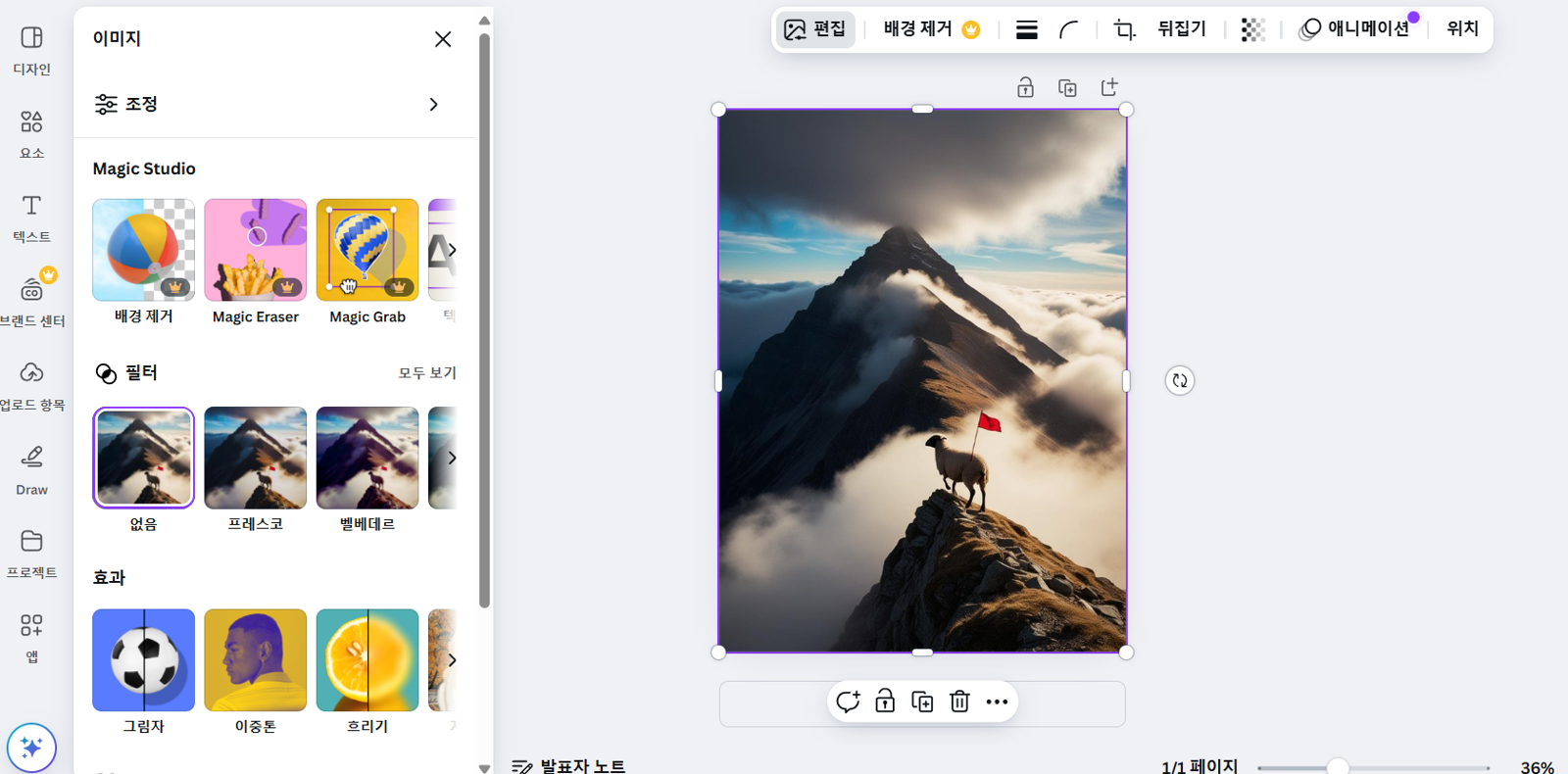 해당 이미지에 마우스를 갖다대면 보라색 버튼으로 "편집"이라는 버튼이 나오는데, 저는 이걸 이용해서 조금 더 수정을 하려고 해요.