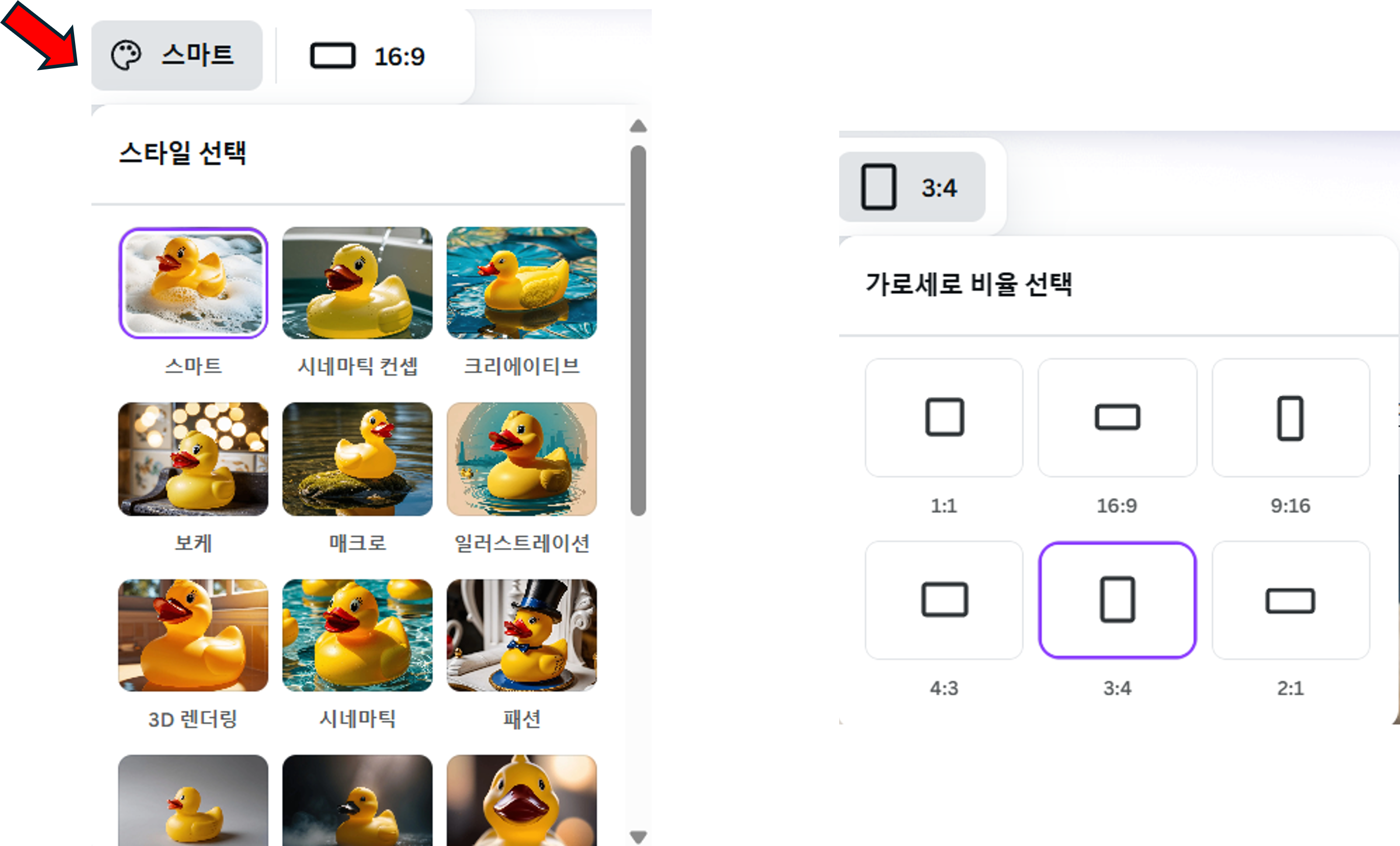 그래서 이번에는 제가 원하는 스타일로 그림체를 바꿔주려고 해요. 입력창 아래의 "스마트" 버튼을 클릭하면 스타일을 선택할 수 있는 창이 나와요. 저는 여기서 "시네마틱"을 선택해주었어요.