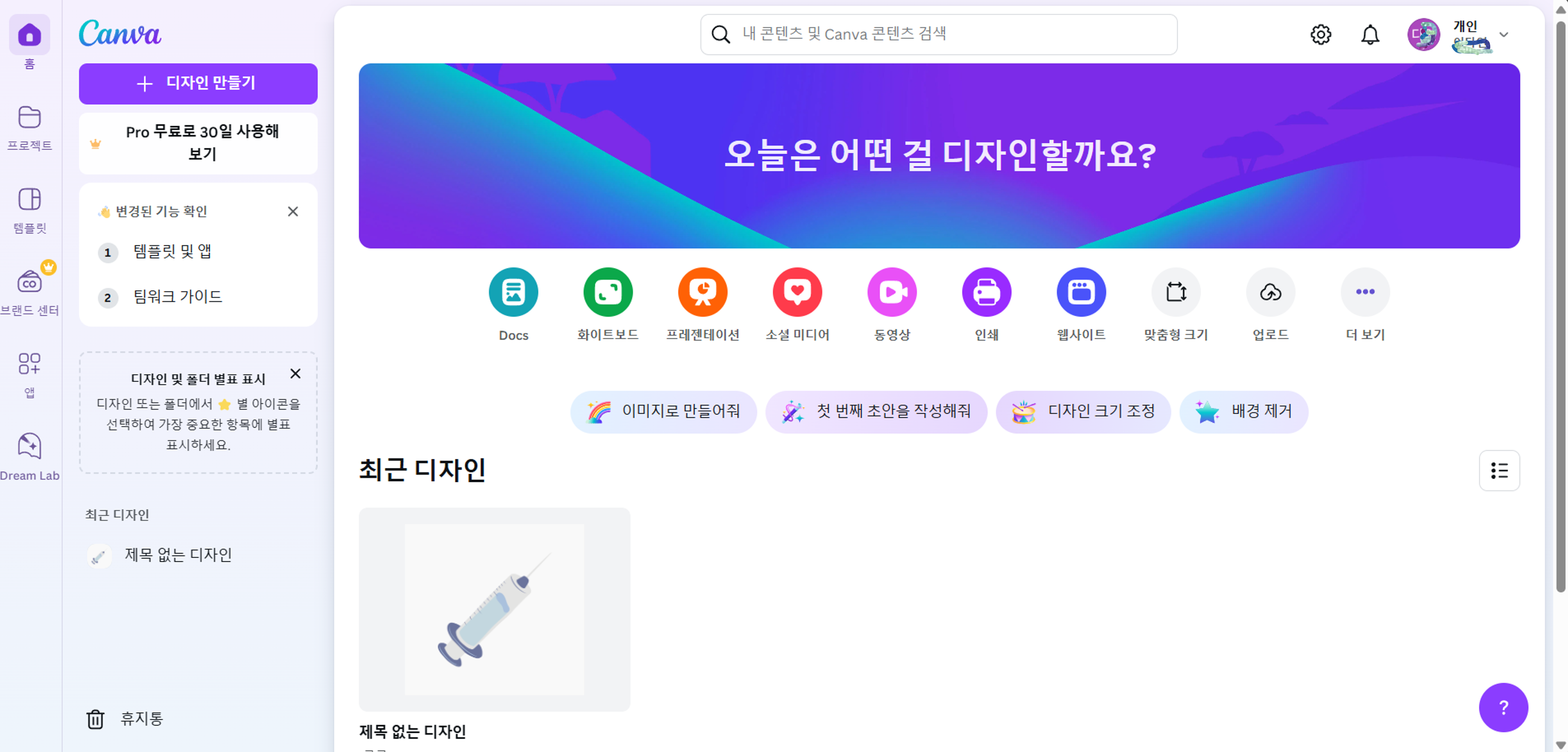 Canva에 가입하고 나면 위와 같은 화면이 나와요.