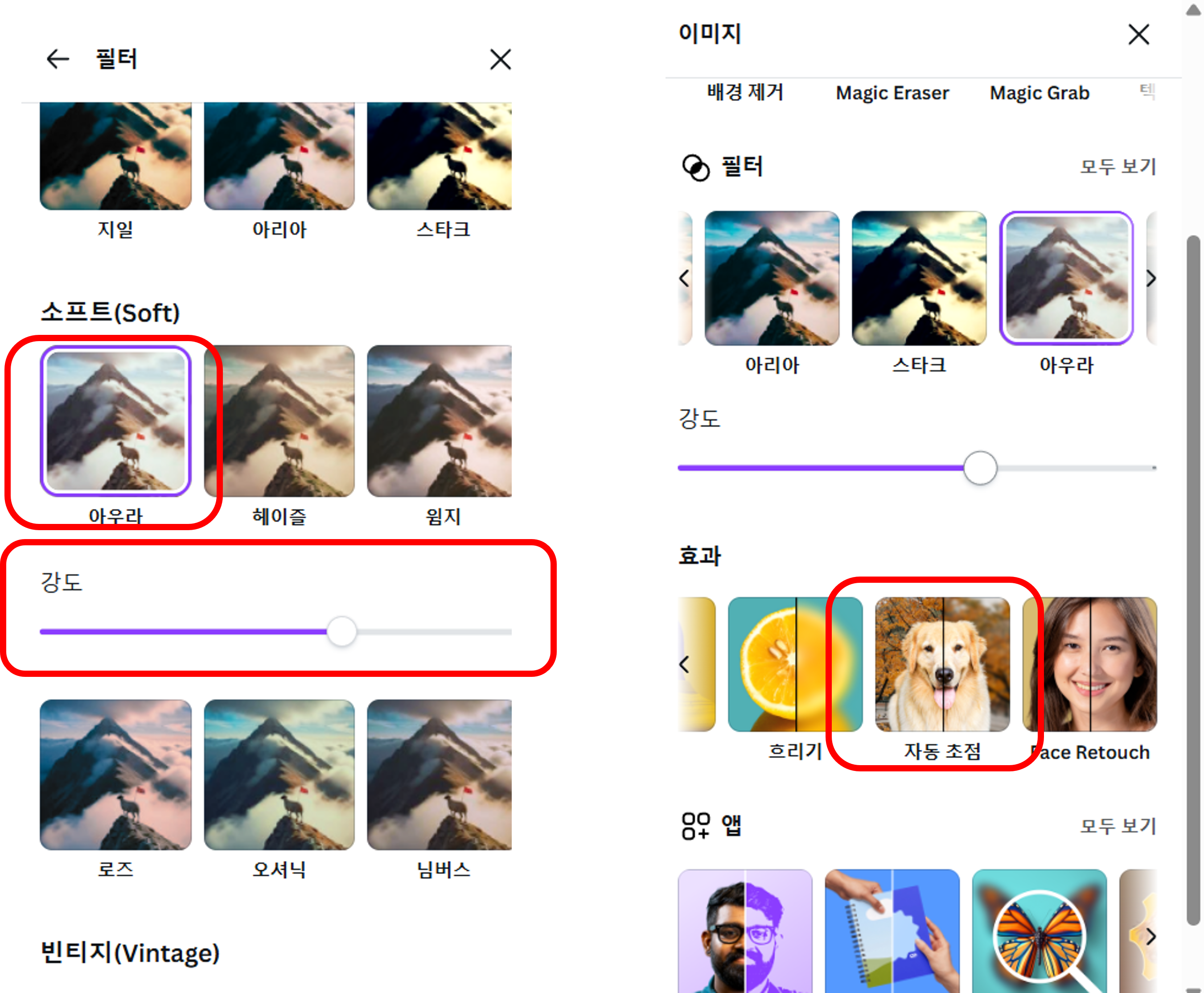 저는 소프트(Soft)라는 필터를 선택하고 "아우라"라는 필터를 다시 선택했어요.