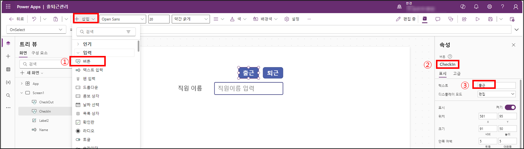 ③ 텍스트를 "출근"으로 변경