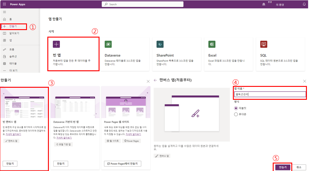 1. 새 캔버스 앱 만들기