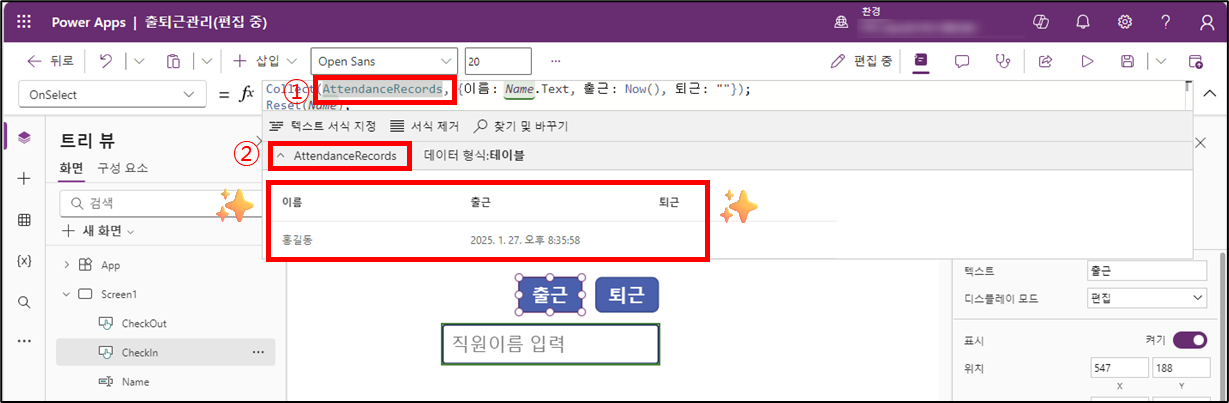 Collect(AttendanceRecords,{이름: Name.Text,출근: Now(),퇴근: ""});