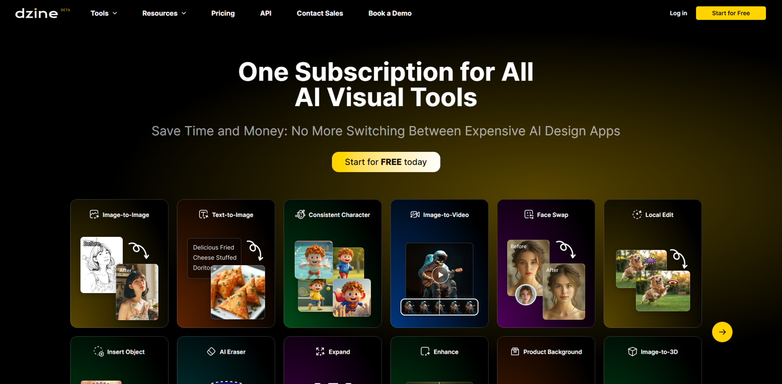 dzine에서 제공하는 여러가지 기능들이 소개되어 있는 걸 확인할 수 있어요.