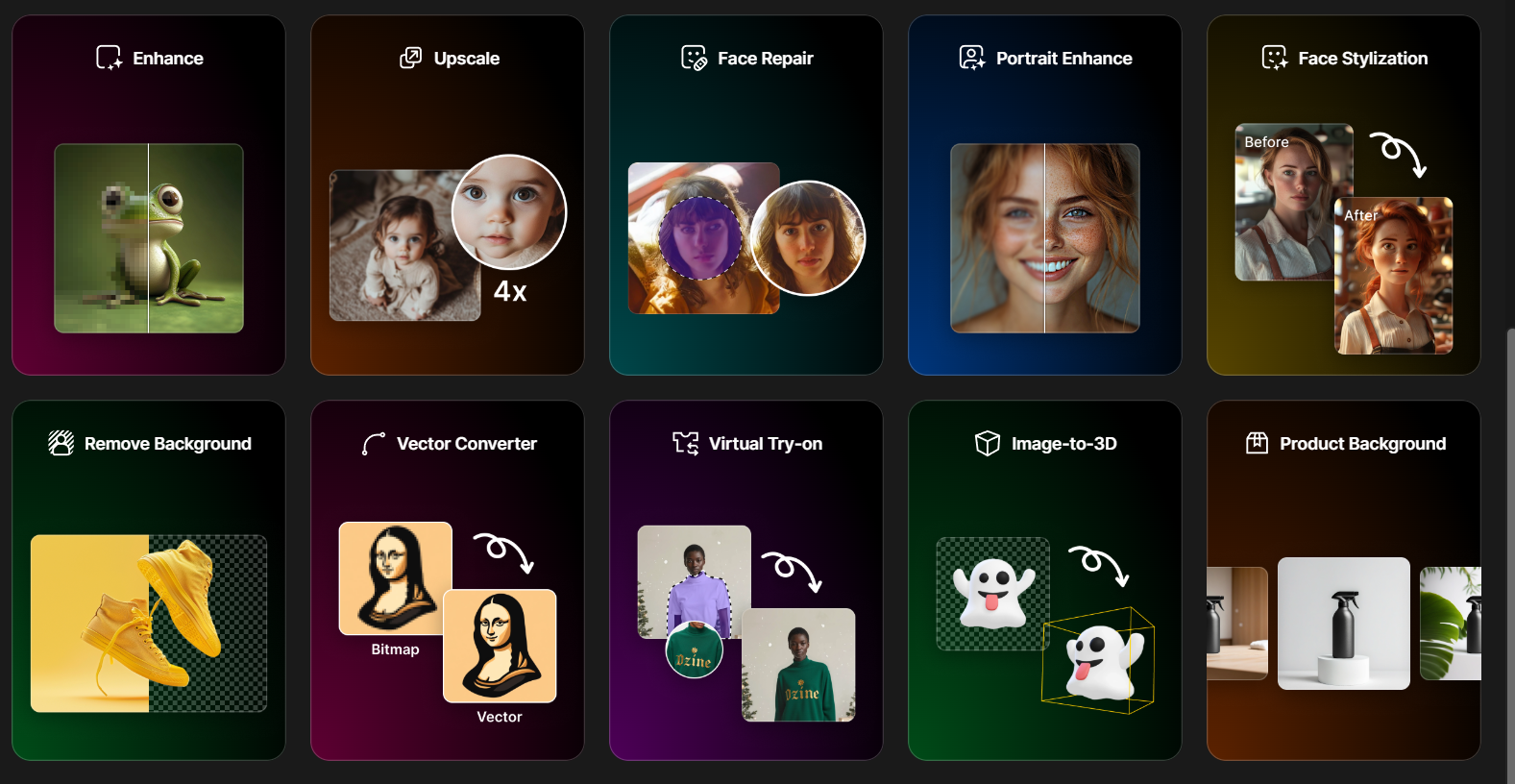 제품 배경 디자인, 2D에서 3D 변환, image to video, 이미지 업스케일링 등