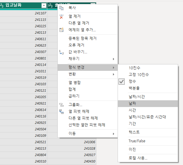 동일한 방법으로 출고날짜까지 바꾸어 주면, 숫자 형식을 날짜 형식으로 바꿀 수 있습니다.