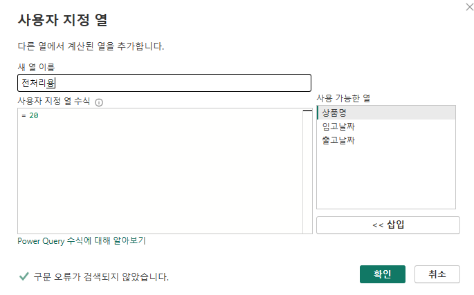 열 이름을 "전처리용"으로 정하고, 값에 20을 넣어보겠습니다.