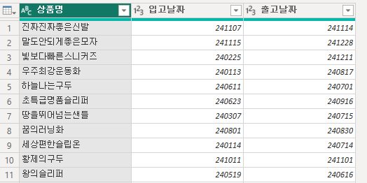 | 상품명 | 입고날짜 | 출고날짜 |