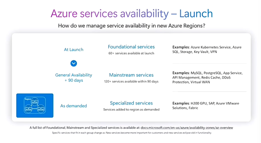- Microsoft는 모든 리전을 일관된 방식으로 구축하며, 다음과 같이 단계적으로 서비스가 제공됩니다.