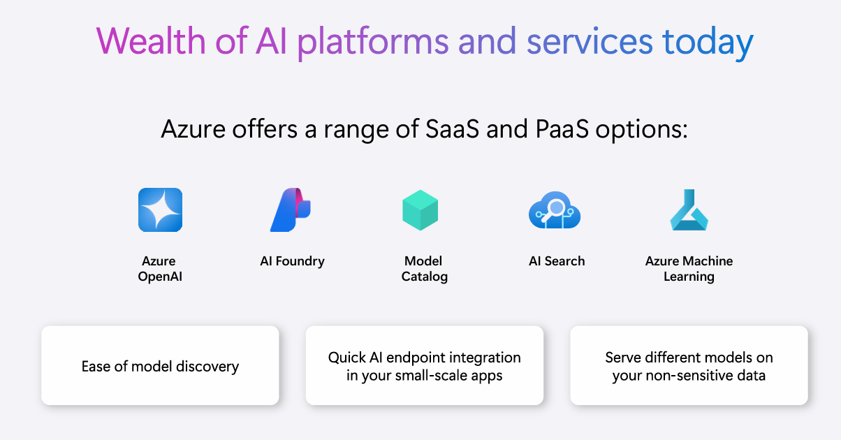 - Azure OpenAI, AI Studio, 모델 카탈로그. AI Search, Azure ML 등 완전한 AI 서비스 플랫폼 제공