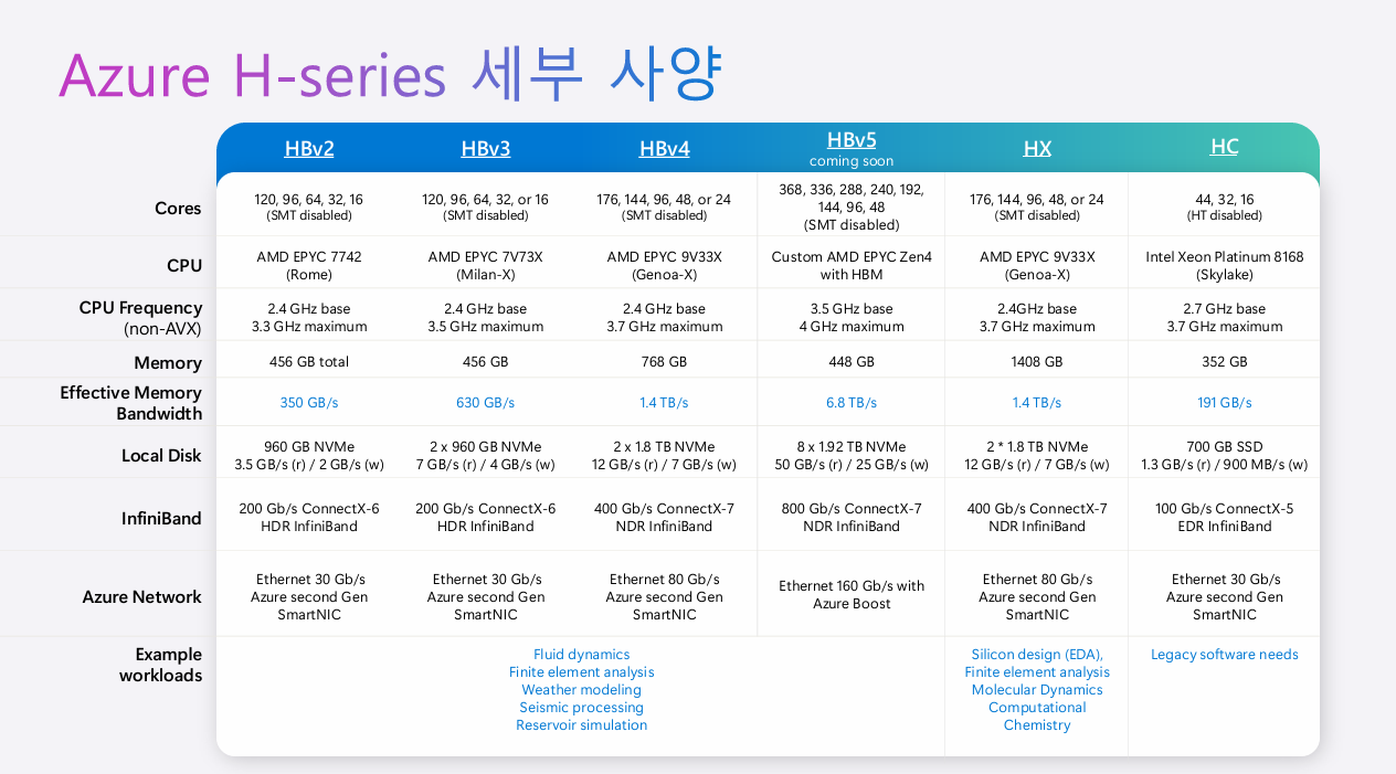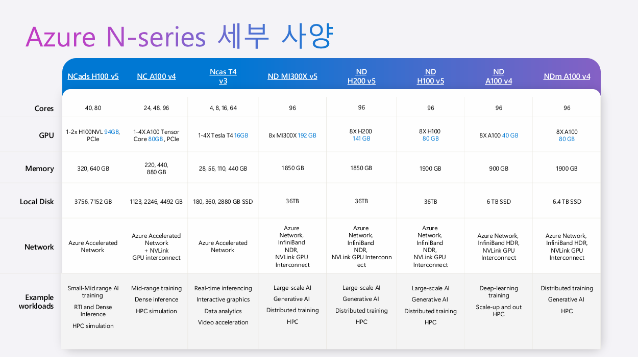 Azure의 HPC·AI 전용 가상머신(VM)은 크게 GPU 기반 N 시리즈와 CPU 기반 H 시리즈로 나뉩니다.