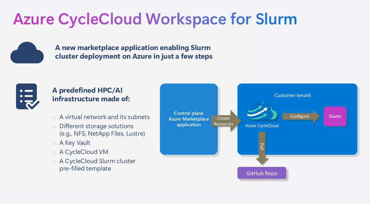 - Azure CycleCloud + 기존 스케줄러(Slurm, LSF)로 동일 환경 구현