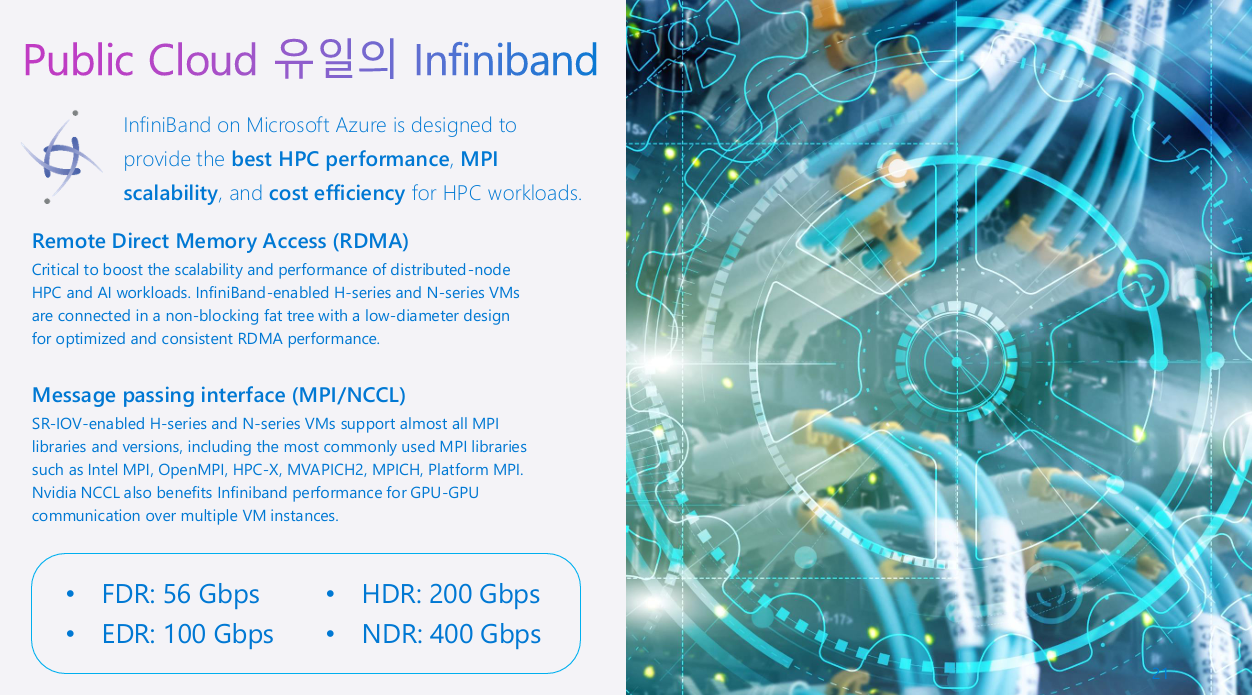 💡 Azure가 제공하는 HPC·AI 인프라는 50년간의 마이크로소프트 기술 투자와 최고 민간용 슈퍼컴퓨터·클라우드 유일 InfiniBand 지원 등 타사 대비 독보적인 경쟁력을 갖추고 있습니다.