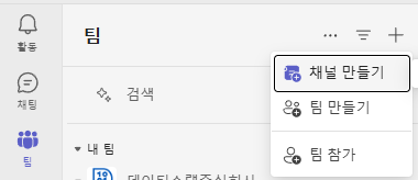 2. Teams의 Team 탭에서 채널을 생성해요!