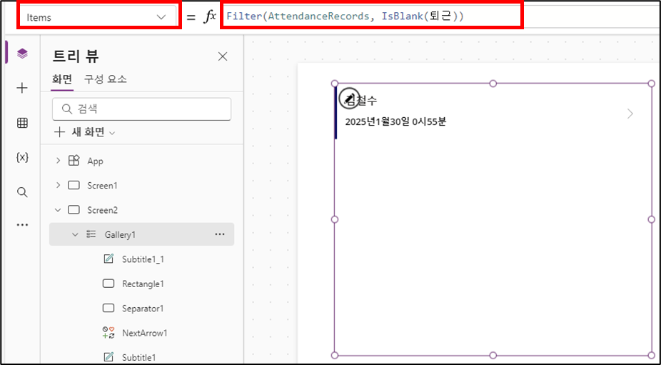 ⓛ 갤러리의 Items 속성을 "AttendanceRecords"로 설정
